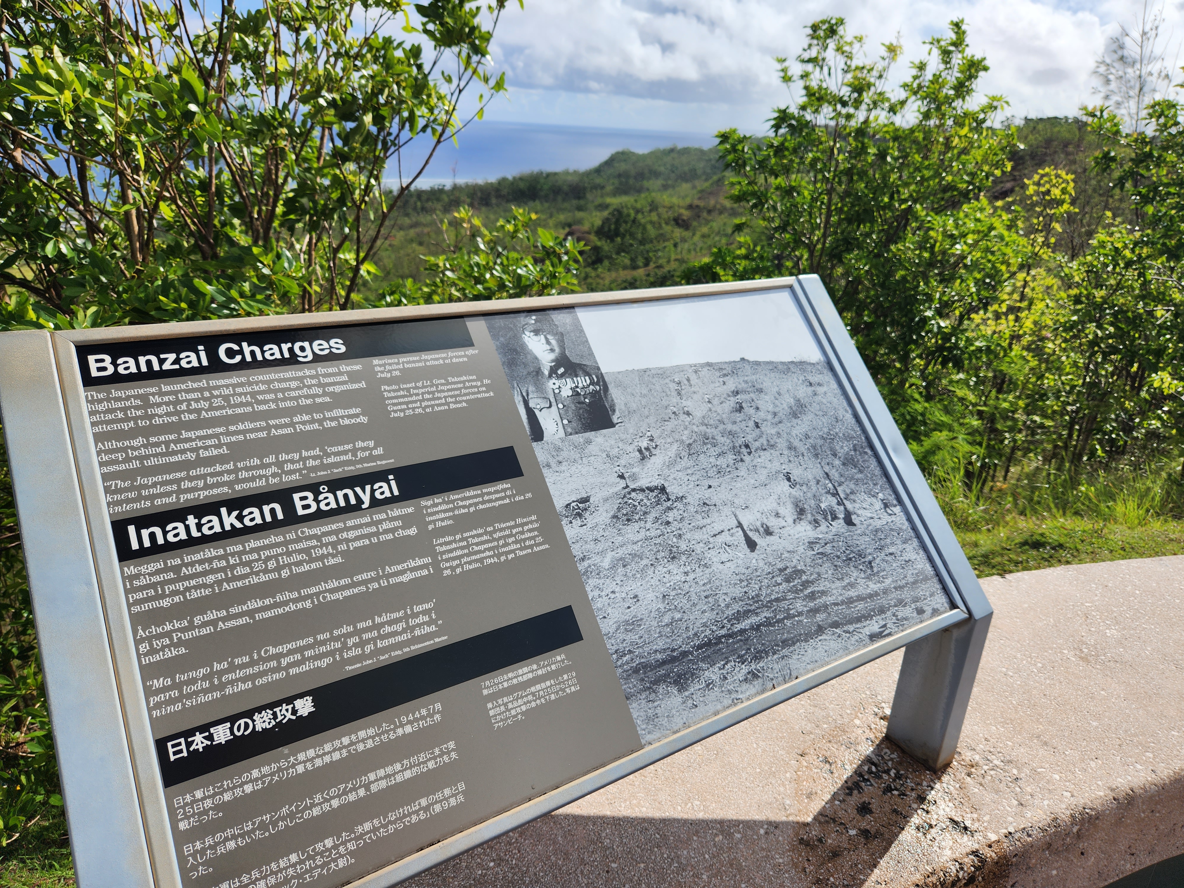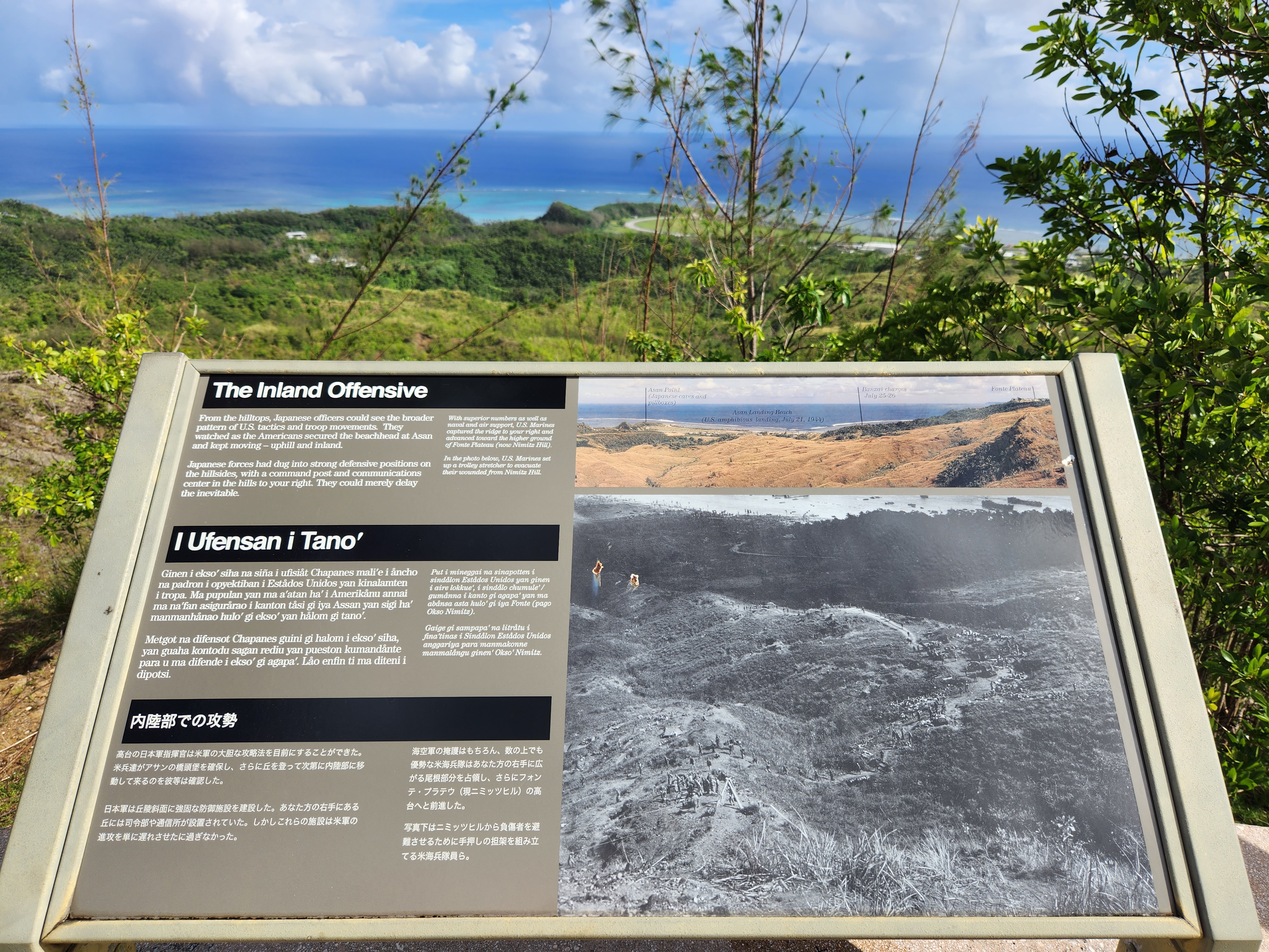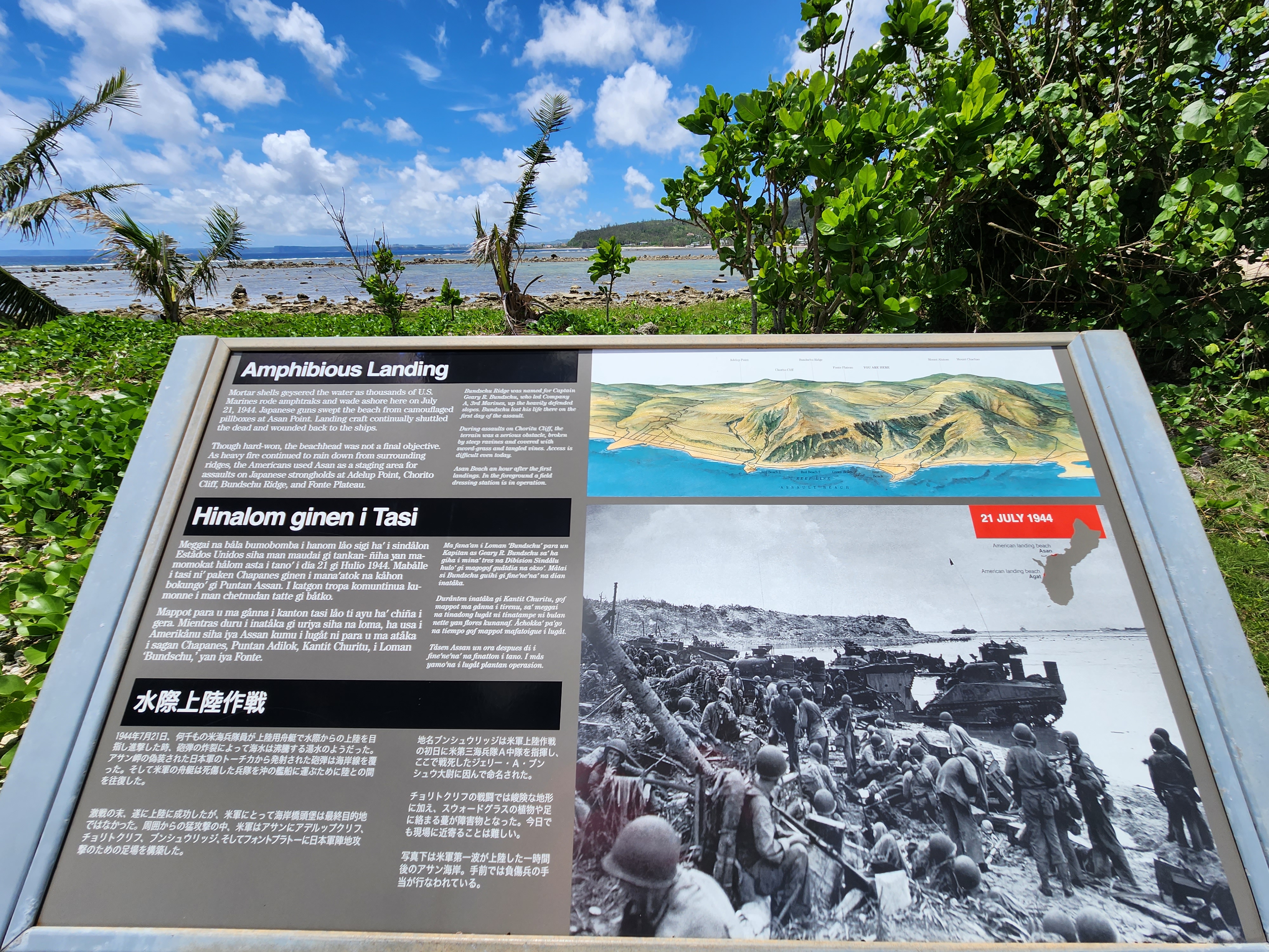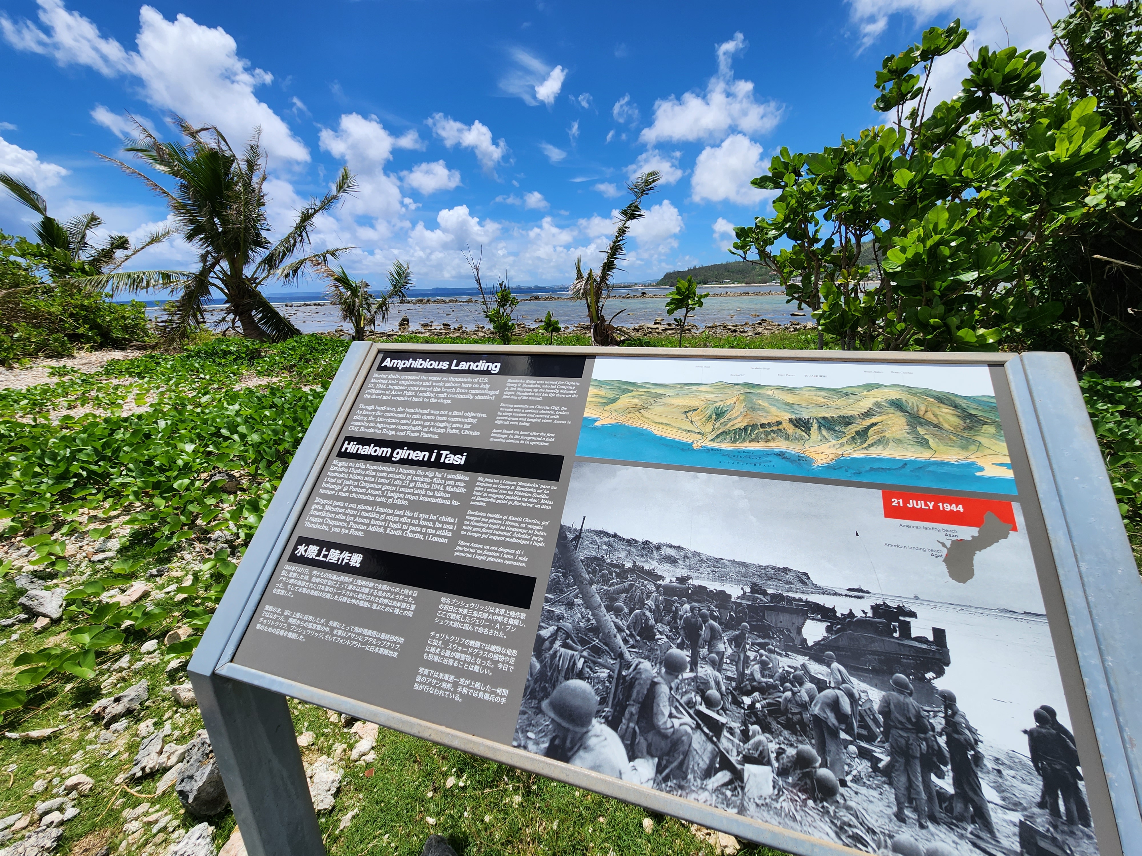 Bill’s first day of his War in the Pacific experience was on the island of Guam. One of the real priorities for on Guam was for Bill to walk in his ancestors footsteps, so to speak, and see the locations where his grandfather and grandfather in law spent time during WWII. To that end, a great deal of time and effort was spent exploring Asan Beach, the Asan Bay Overlook, and the Japanese Piti Guns emplacement.
