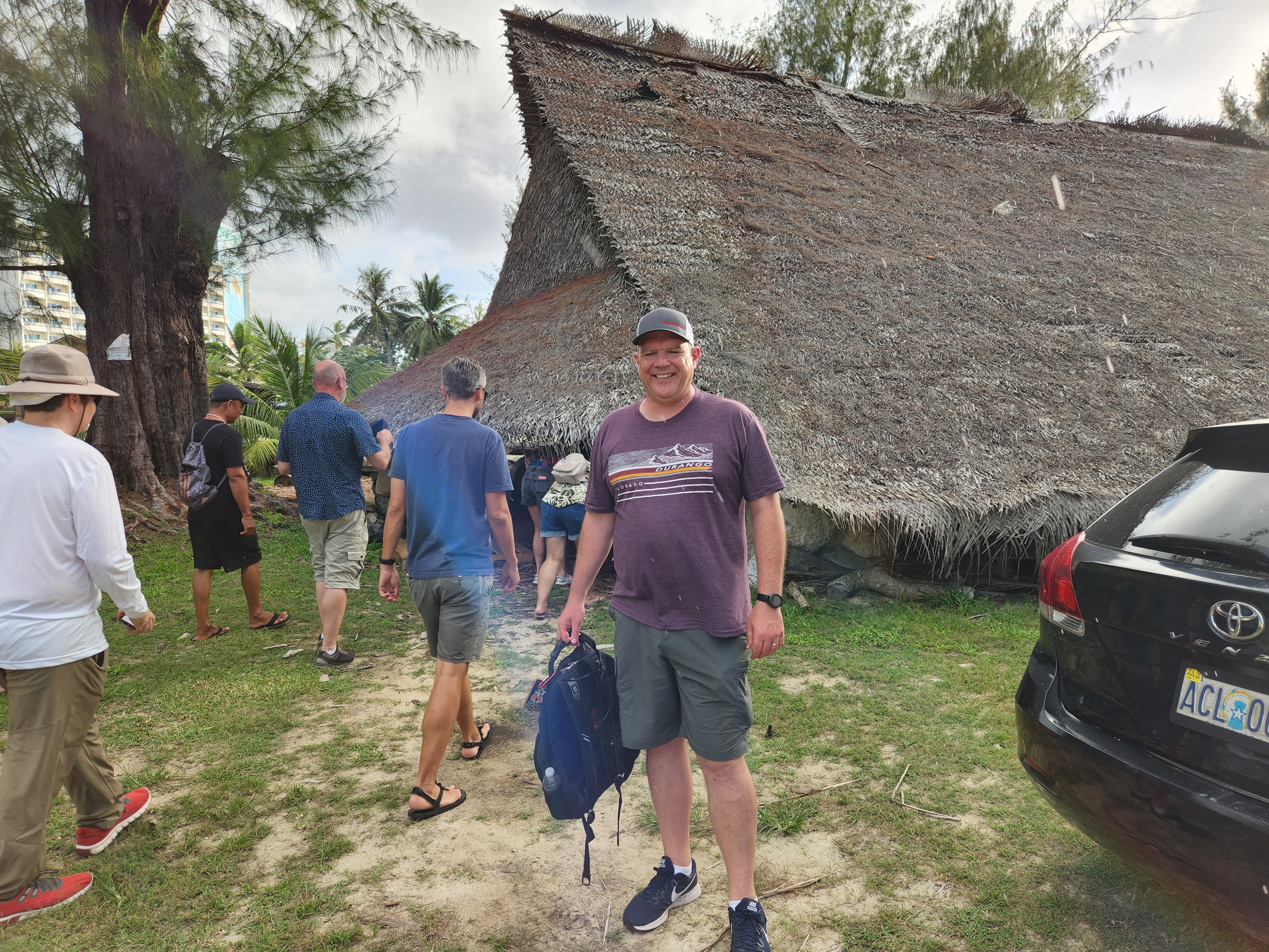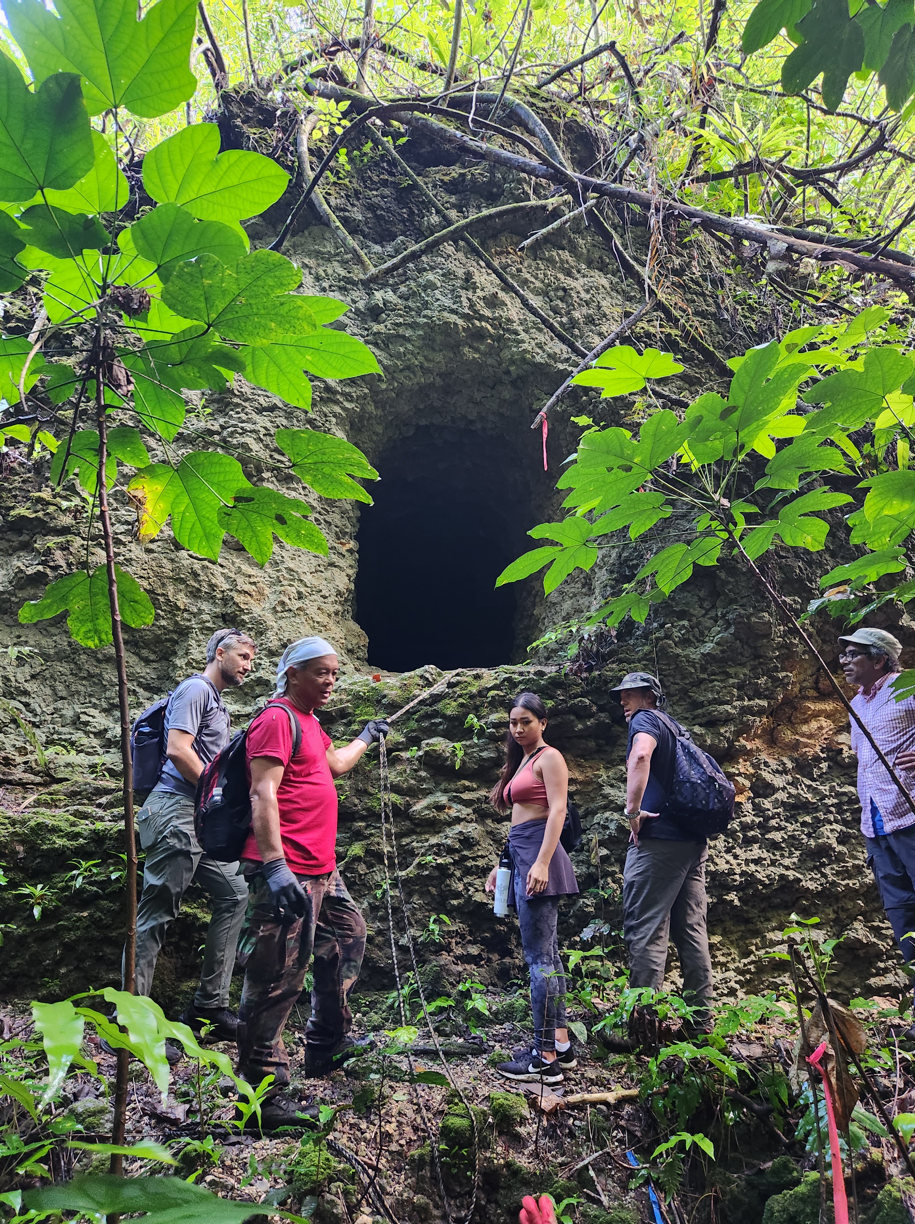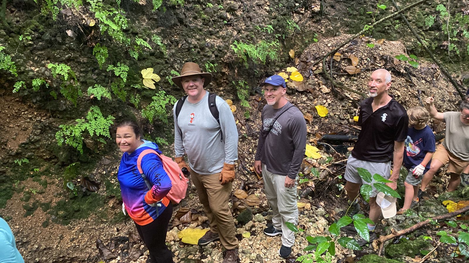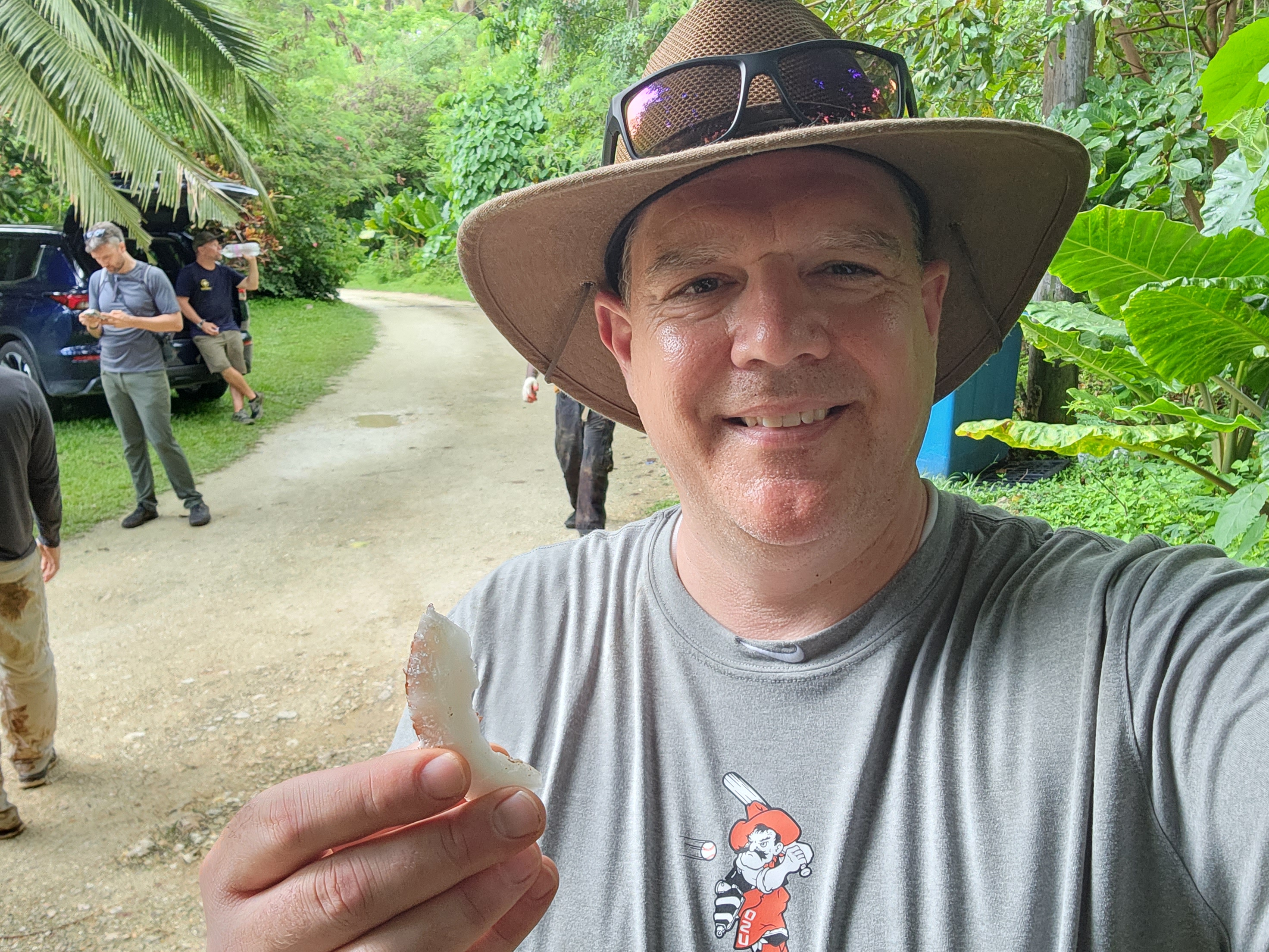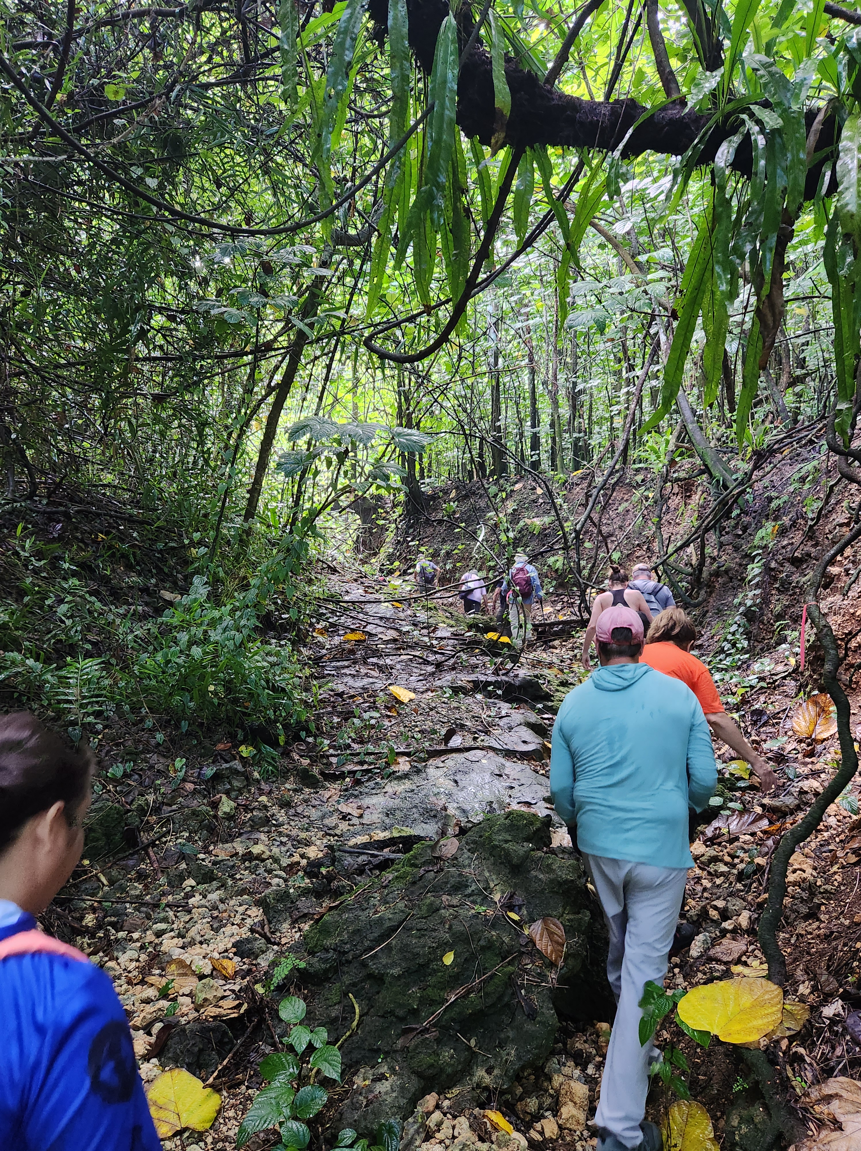 Day 5 of the workshop was an optional day that began with an Indiana Jones type of jungle experience. First, we hiked a dry creek bed through the thick vegetation up a mountainside to a Japanese tunnel system that dates back to WWII. The trek in was a bit treacherous at times and required teamwork in the form of boosting, pulling, and holding ropes for each other to get everyone to the destination, but it was definitely worth it! The tunnel system had four entrances, some of which were more difficult to enter than others, and was an intricate, man-made set of caverns large enough to stand upright and walk in. This complex likely would have been a storage area and refuge for Japanese soldiers in the final days of the Battle of Saipan as American troops closed in. There was even a stairway carved into the rock to connect a lower tunnel to an upper level. A few Japanese markings and a small piece of ceramic from the period added to the intrigue. It was quite a site to visit and we even found and tasted some “football” fruit and fresh coconut along the way!
