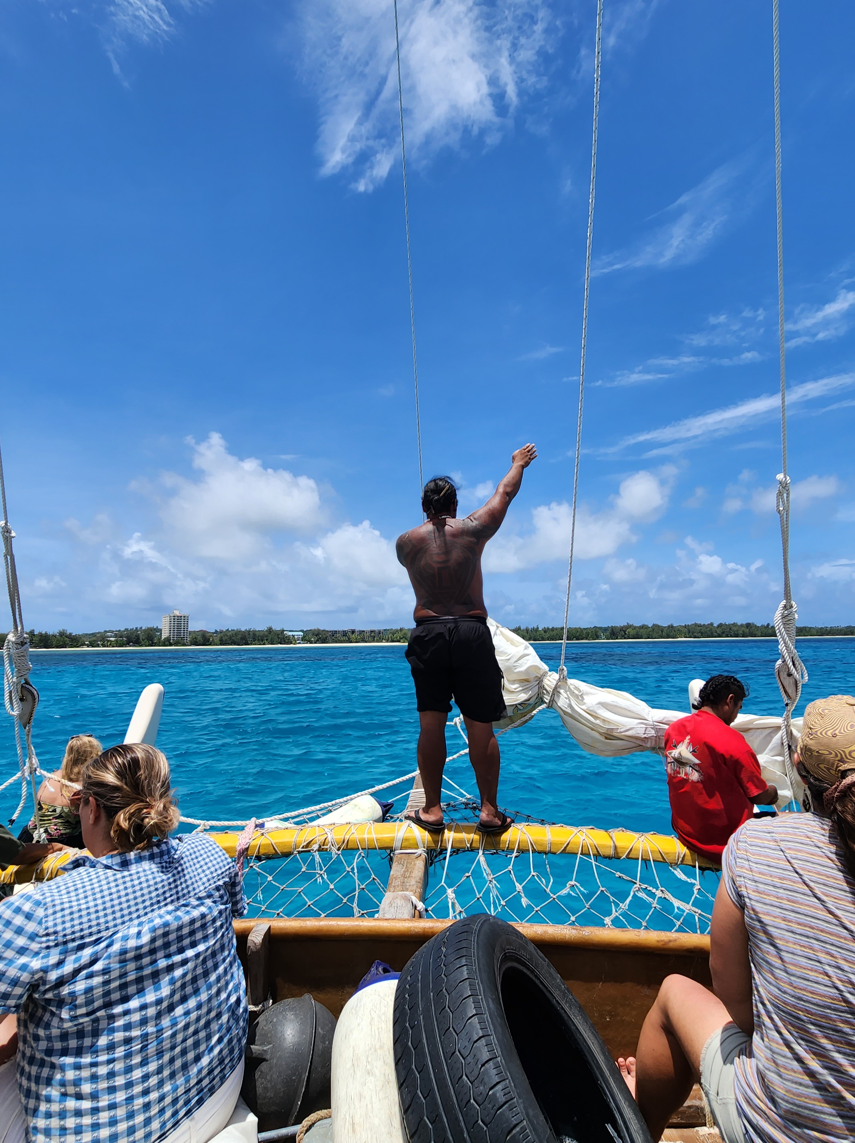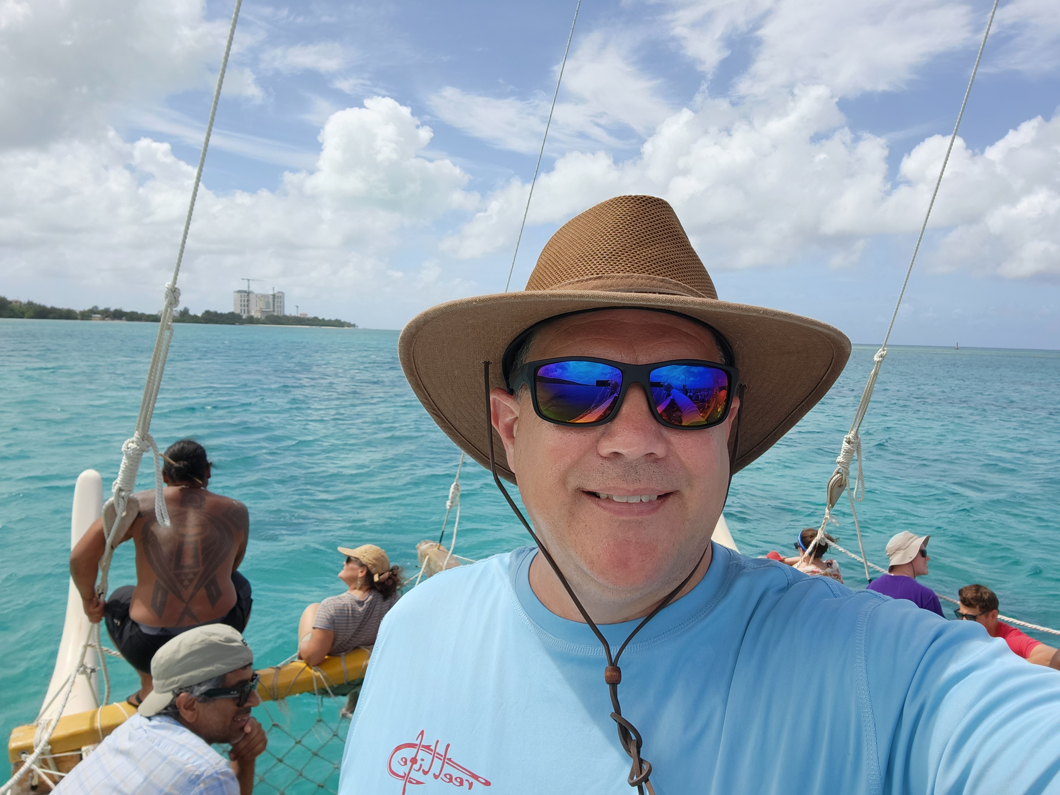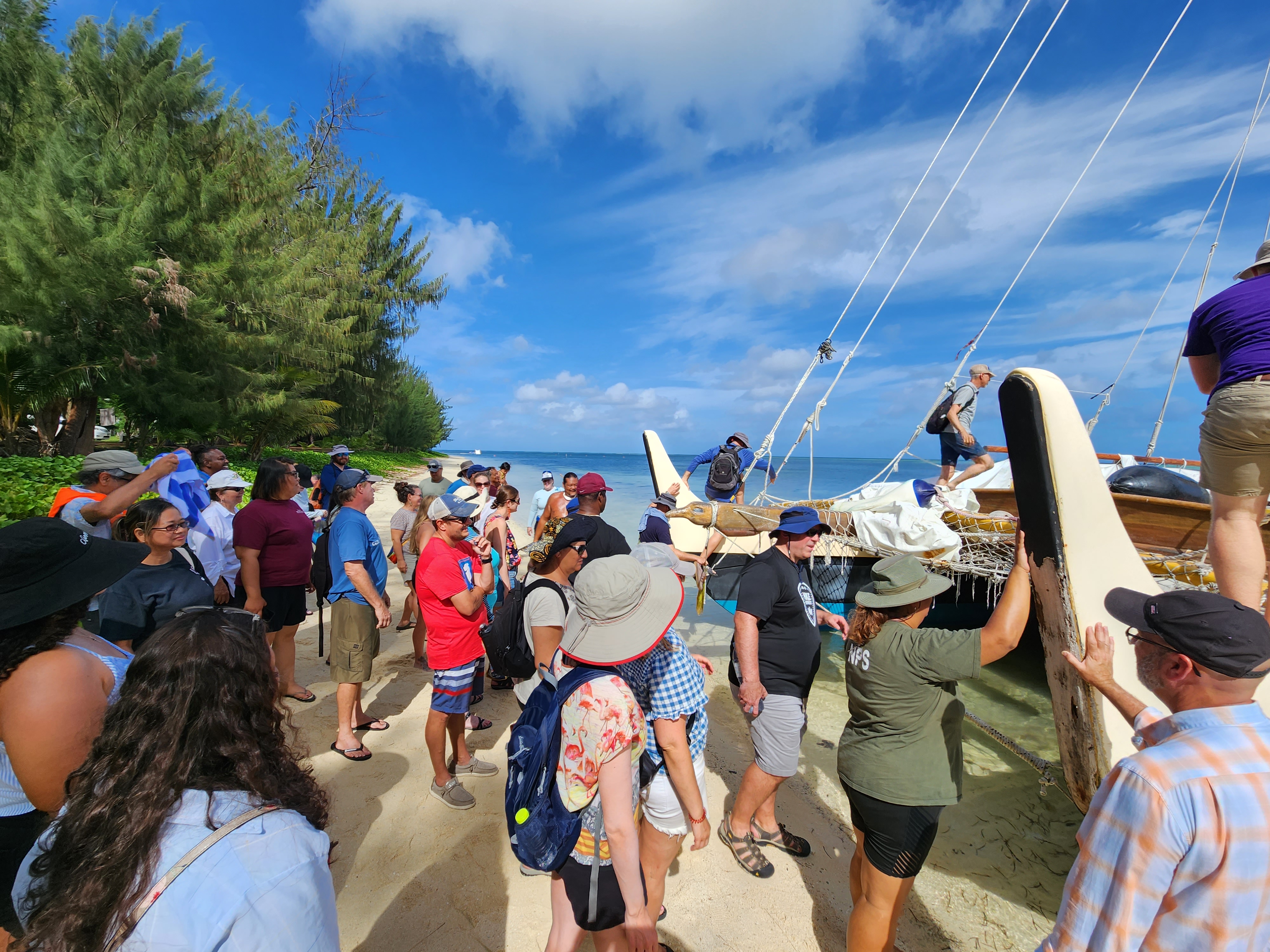The last two days of the Saipan NEH were a combination of classroom time and more adventures. The morning of day 6 was spent on a Polynesian-style hand made wooden “canoe”. The navigators, the evening before during the visit to their huts, offered to take the entire group out for an authentic experience on the water the next morning. It took a bit for everyone to get on board and after a little trouble getting the canoe off the beach with nearly 50 total people aboard, it was afloat. The group was taken out near Managaha Island with aid from a motor while going against the wind and then watched the crew unfurl the sail and let the wind return the ship the several miles back to the starting point. It was quite an experience since most of the teachers had never sailed before.