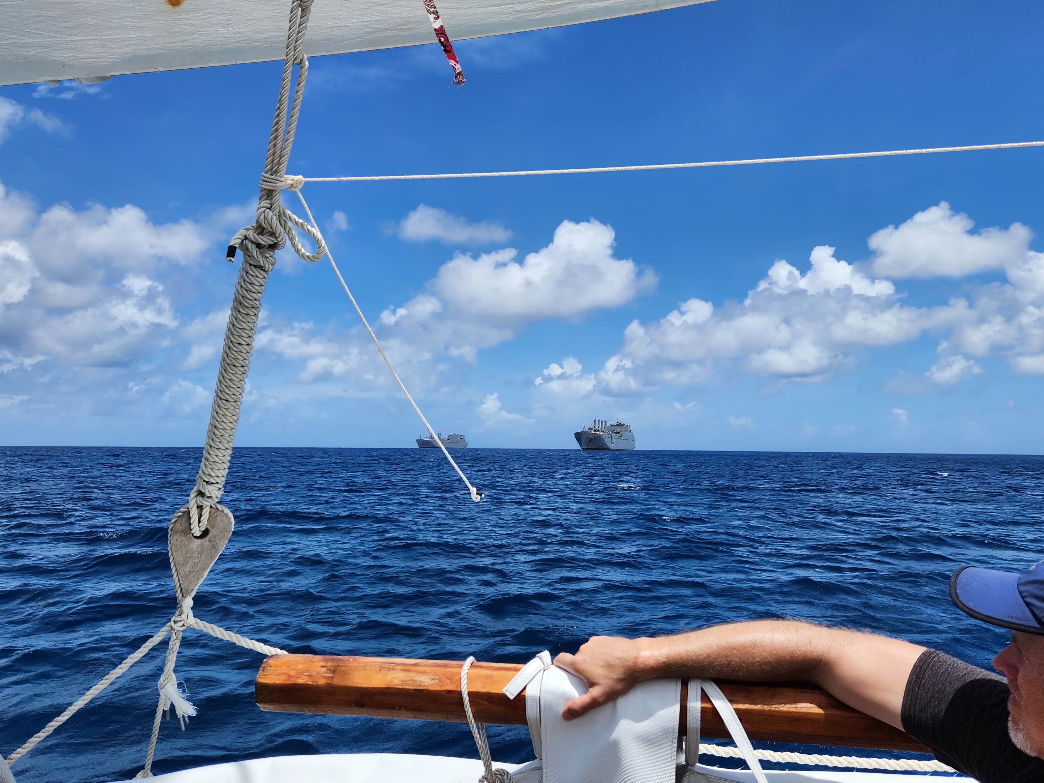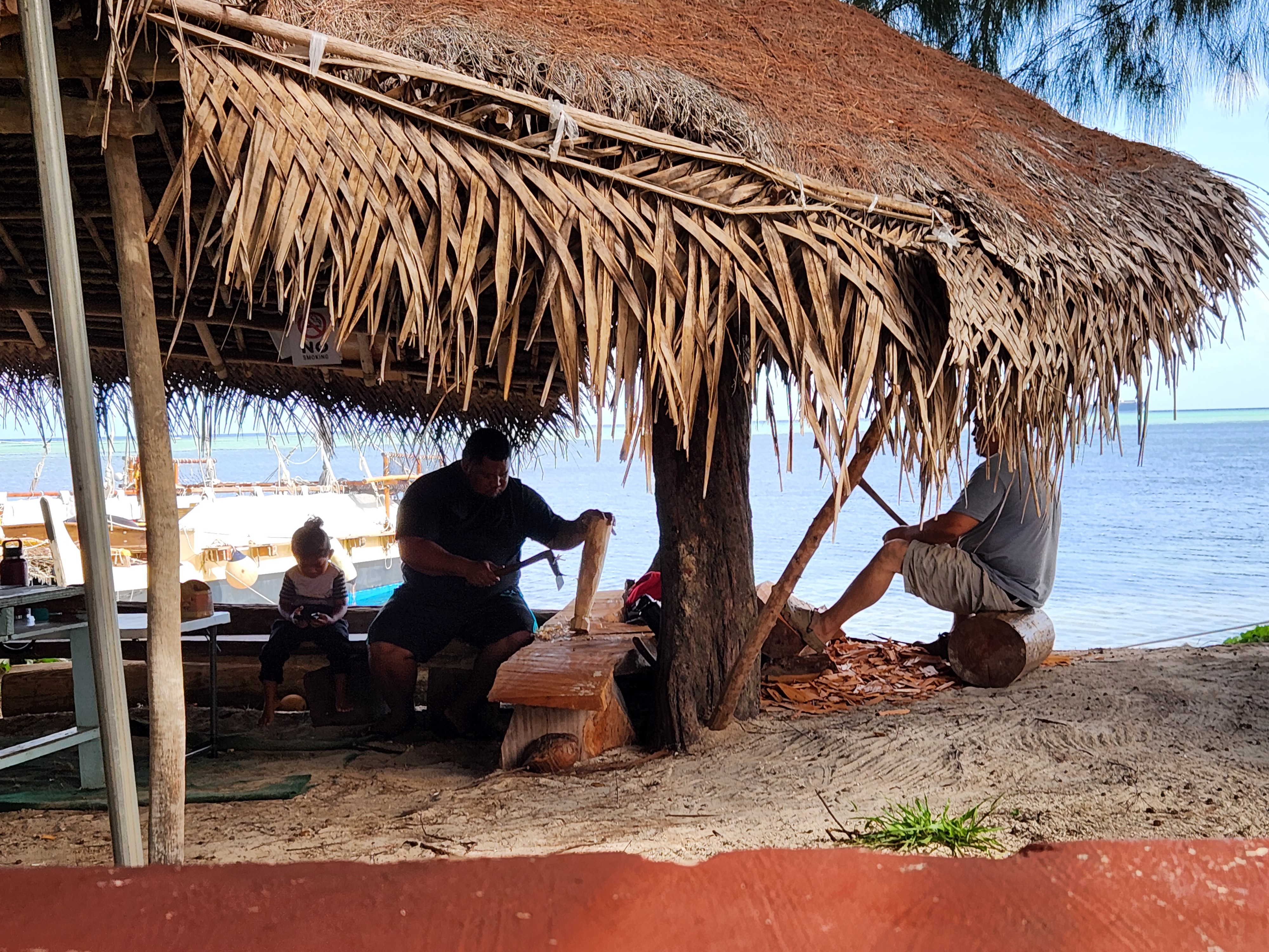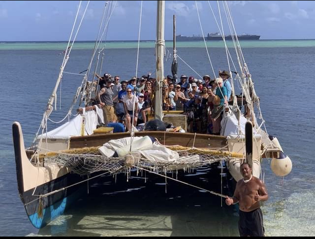 The last two days of the Saipan NEH were a combination of classroom time and more adventures. The morning of day 6 was spent on a Polynesian-style hand made wooden “canoe”. The navigators, the evening before during the visit to their huts, offered to take the entire group out for an authentic experience on the water the next morning. It took a bit for everyone to get on board and after a little trouble getting the canoe off the beach with nearly 50 total people aboard, it was afloat. The group was taken out near Managaha Island with aid from a motor while going against the wind and then watched the crew unfurl the sail and let the wind return the ship the several miles back to the starting point. It was quite an experience since most of the teachers had never sailed before.