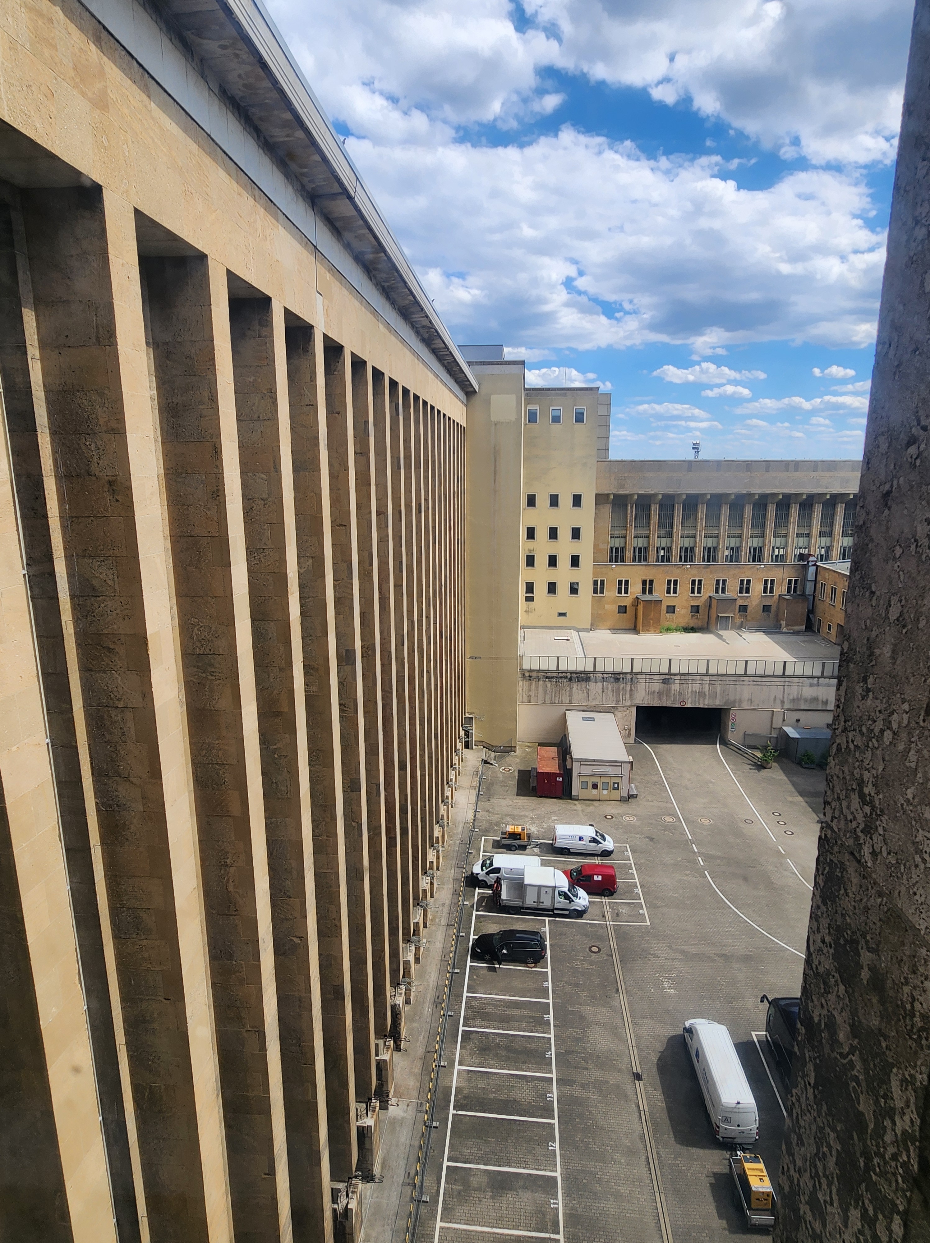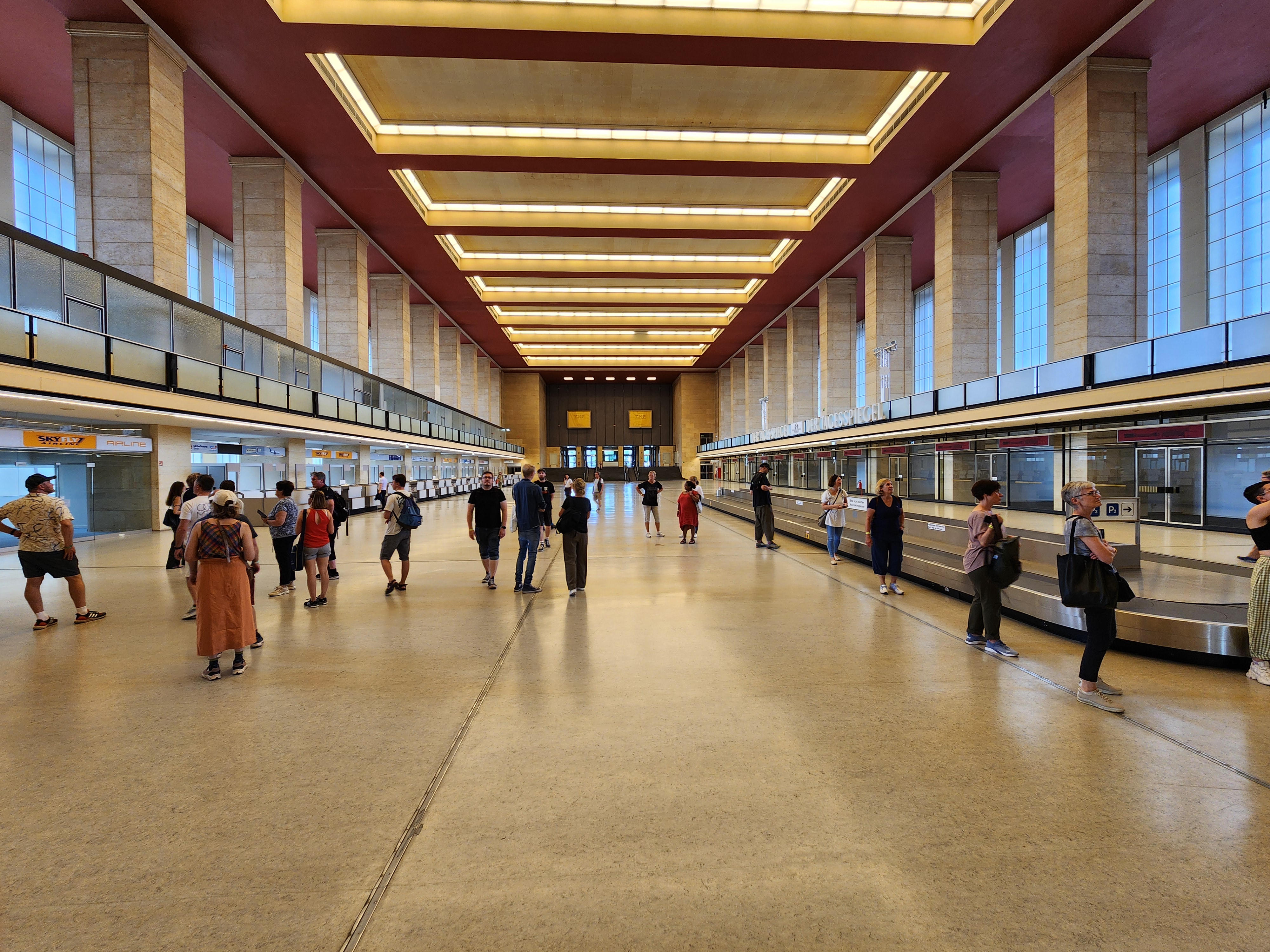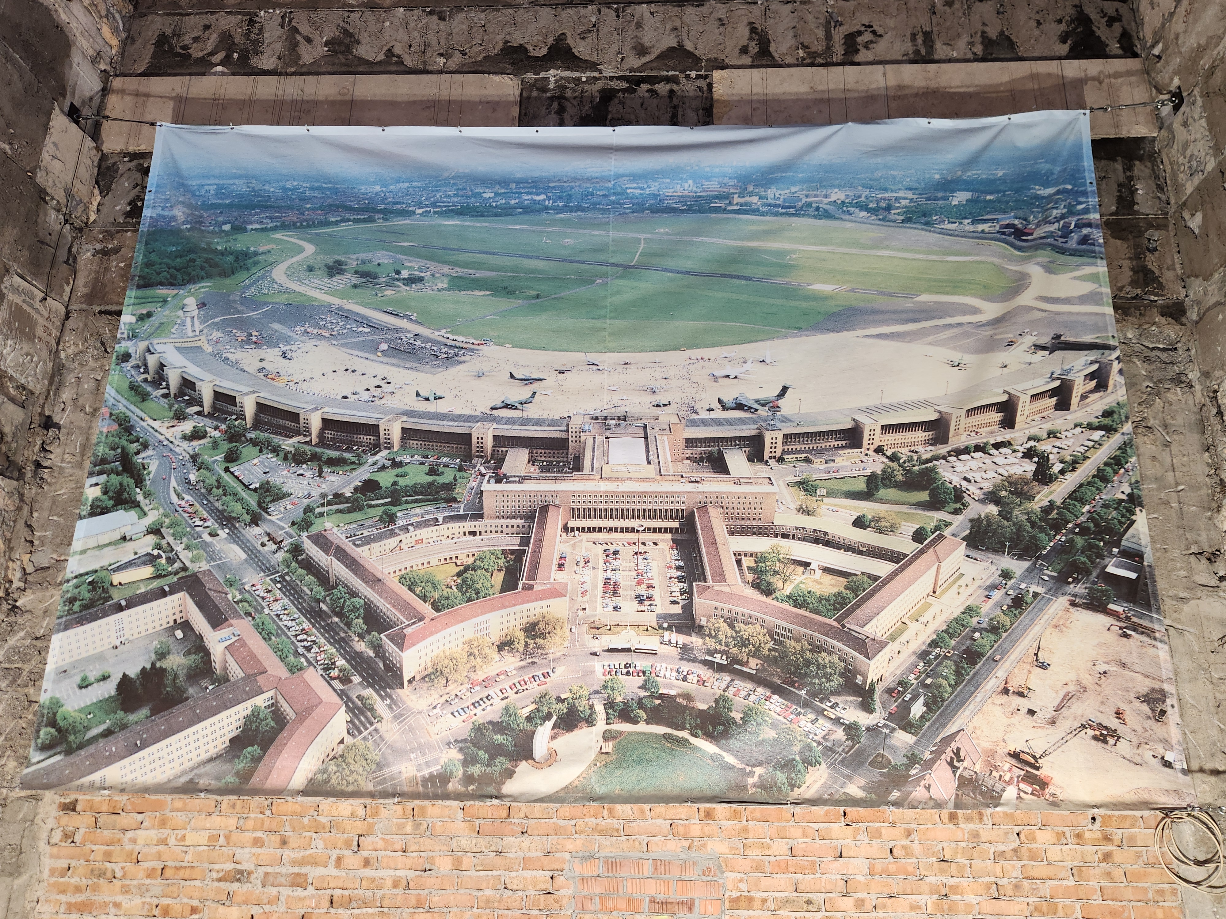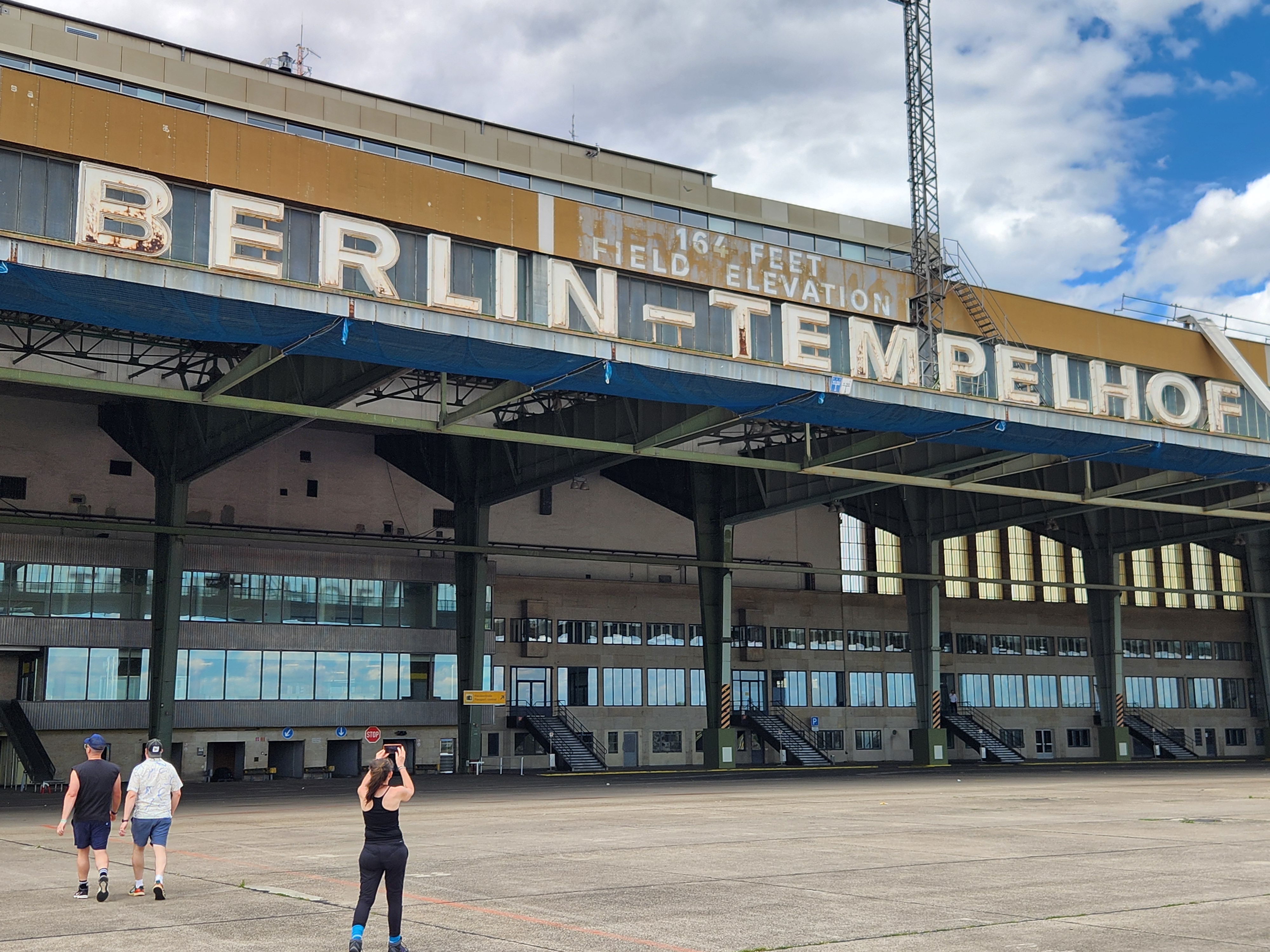 My final day in Germany was mostly spent at Tempelhof Airport. I finally got to visit this iconic location that was witness to the 1936 Olympics, World War II, the Berlin Airlift, and the Cold War. Interestingly, it belonged to the Americans longer than it has been in German control. Construction began around 1932 but after 1945 when WWII ended, it was in West Berlin and in American possession. Most of its life it was an American airbase and commercial airport. From 1990 to 2008, after German reunification, it was a commercial airport but due to its location within the city the runways couldn’t be extended for the larger modern planes. After 2008, it was closed. Though still one of the largest buildings in Europe, it now sits empty. The grounds and runways have been dedicated as a public space for all types of outdoor activities and artistic and cultural enterprises. There are plans to redo part of the building for exhibitions and a historical center with a concert hall and event spaces for rent, but the work is ongoing. For now, the structure is as it was when the doors closed in 2008.